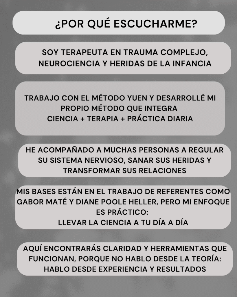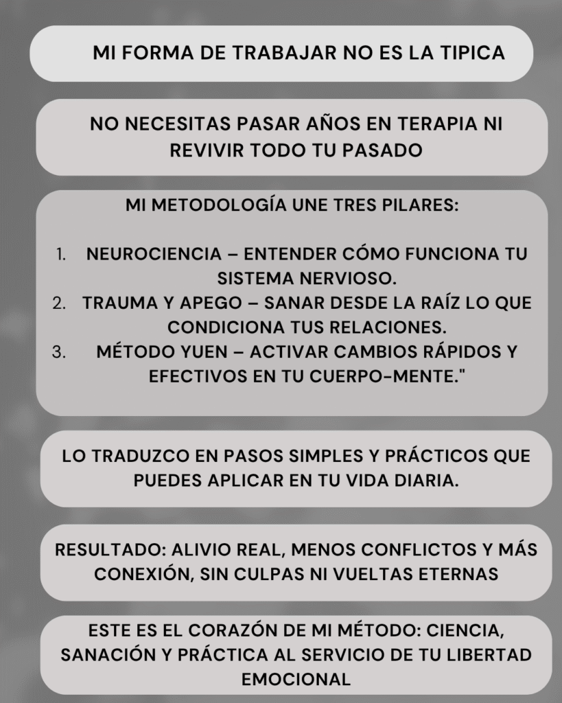 Experta en el Método Yuen, una técnica avanzada de corrección energética que permite liberar bloqueos físicos, emocionales y mentales de manera rápida y efectiva. Mi trabajo consiste en identificar las causas ocultas de tus molestias y fortalecer tu energía para que recuperes tu equilibrio natural. Mi misión es ayudarte a vivir sin limitaciones, en un estado de bienestar, claridad y fortaleza interior.